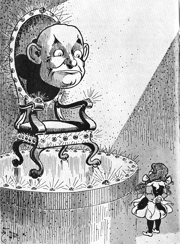 마녀는 구두를 빼앗기 위해 도로시에게 부엌일을 시키며 기회를 엿보았습니다. 마녀가 구두를 빼앗으려 하자 화가 난 도로시가 마녀에게 물을 끼얹었고, 물에 닿은 마녀는 갈색 물로 녹아 사라져 버렸습니다. 자유의 몸이 된 도로시는 일행을 구출하고, 황금 모자 마술로 날개 달린 원숭이를 불러 에메랄드 시로 돌아갔습니다. 도로시 일행이 에메랄드 시에 도착하자 오즈는 그들을 피하지만, 토토가 오즈 앞에 쳐진 장막을 당기면서 진짜 정체를 들키게 됩니다. 오즈의 마법사는 사실 오마하 출신으로 복화술을 익힌 서커스단의 기구 여행가였는데, 젊었을 때 기구를 탔다가 실수로 바람에 날려 오즈에 오게 되었습니다. 지금껏 오즈의 시민들을 속여 가며 마법사 행세를 해왔던 것이었습니다.