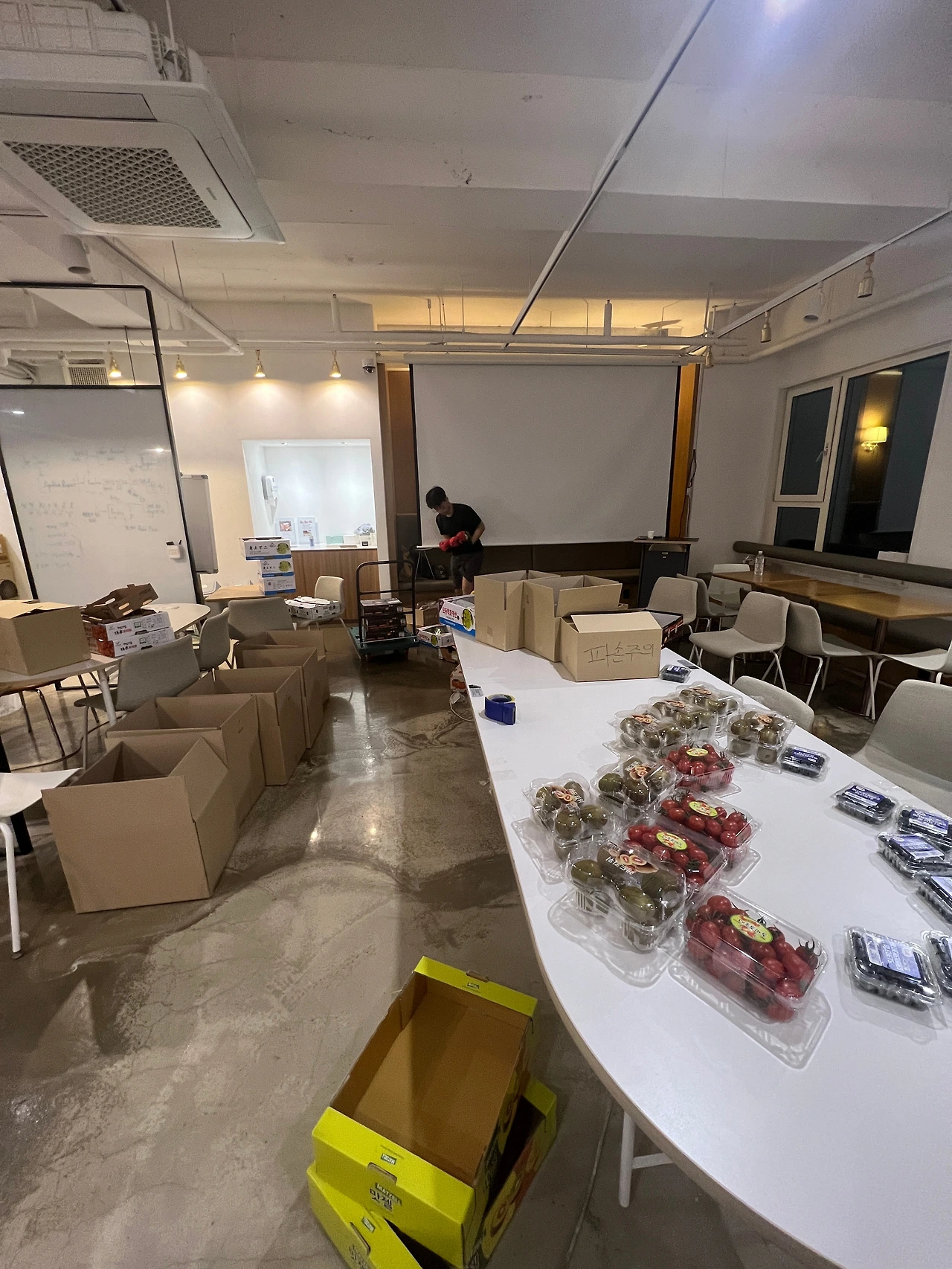다행히 우리가 사용하는 공유 오피스는 넓었고 새벽 작업 시 사용하는 사람이 없어 매우 적합했다. 과일을 나를 구르마와 포장에 필요한 장갑, 테이프, 다양한 크기의 포장 박스, 완충제 등을 준비하면서 전국 배송 준비를 마쳤다.