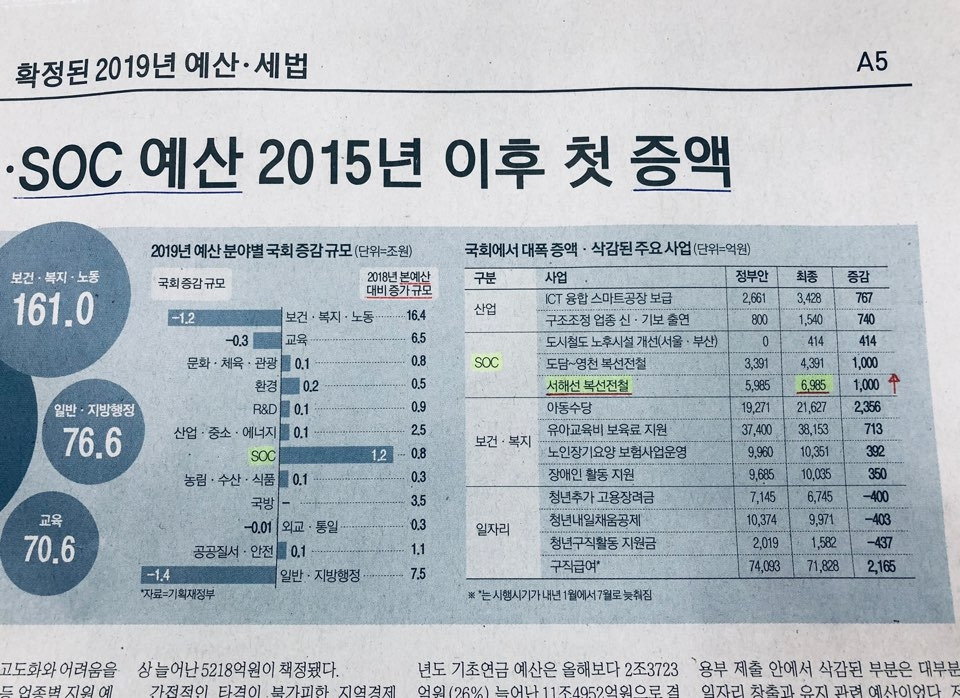 △ 기사의 제목대로 SOC 예산이 크게 증액됐다는 것을 확인할 수 있어요. 무려 1조 2,000억 원이나 올랐죠. 그중에서도 가장 눈에 띄는 부분은 서해선 복선전철에 관한 증액이었습니다.