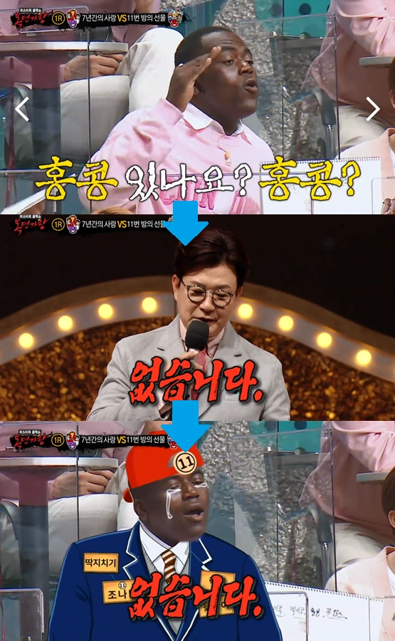 PD는 이 장면을 그냥 넘어가지 않았다. 희극적 요소를 제대로 갖추었기 때문이리라. 통상적 액션, 비통상적 리액션의 구조다. 웃음은 뜻밖의 반전에서 온다. 반전을 위해 차곡차곡 '빌드업'을 쌓는다. 코미디의 원전, 슬랩스틱도 이런 흐름을 따른다. 잘 걷다가 어처구니없이 자빠지는 코미디언을 보면 저절로 웃음이 터진다. 영화에도 나온다. 영화 <인디아나 존스>의 주인공 존스 박사 앞에 아랍인 악당이 큼지막한 칼을 휘두른다. 장시간 진지하게. 가만히 지켜보던 존스 박사가 심드렁하게 권총을 꺼내 ‘빵’하고 쏜다. 말하자면 조나단이 아랍인 악당 역할이다. 기대를 품고 조심스럽게 또 천진난만하게 진행자에게 묻는다. 그보다 앞서 정답을 맞히는 이들을 열거한다. 진행자가 여러 나라를 랩하듯 말하는 장면도 정성스런 빌드업이다. 마침내 진행자가 “No!” 짧게 답한다. 상황 자체가 웃긴다.