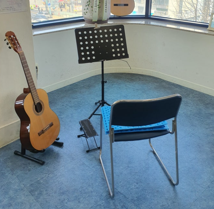 안방 맞은편 작은 방이 연습실이 된다. 붙박이장에서 발판과 ‘보면대’를 꺼낸다. 보면대는 악보를 거치하는 일종의 키 큰 독서대다. 발판은 오른발 아래에 받쳐 기타를 몸에 더 바짝 붙일 수 있게 해 준다. 악기가 멀면 코드를 정확히 짚어 연주하기가 어렵다. 통기타와 다르게 클래식 기타는 왼발 아래에 발판을 둔다. 연주하는 자세의 차이 때문이다. 통기타는 통상 옆구리에 끼고 연주하고 클래식 기타는 두 다리 사이 몸 가운데에 두고 연주한다. 아내의 화장대 의자가 오늘은 악기 연주용이 된다. 「사랑이 아니라고..」 노래는 앞서 코드를 변환했으므로 원래 음계로 연주하려면 ‘카포’라고 부르는 집게처럼 생긴 도구를 써야 한다. 카포는 기타 목(neck)에 걸어 여섯 개의 줄을 전체적으로 음계를 높여준다.