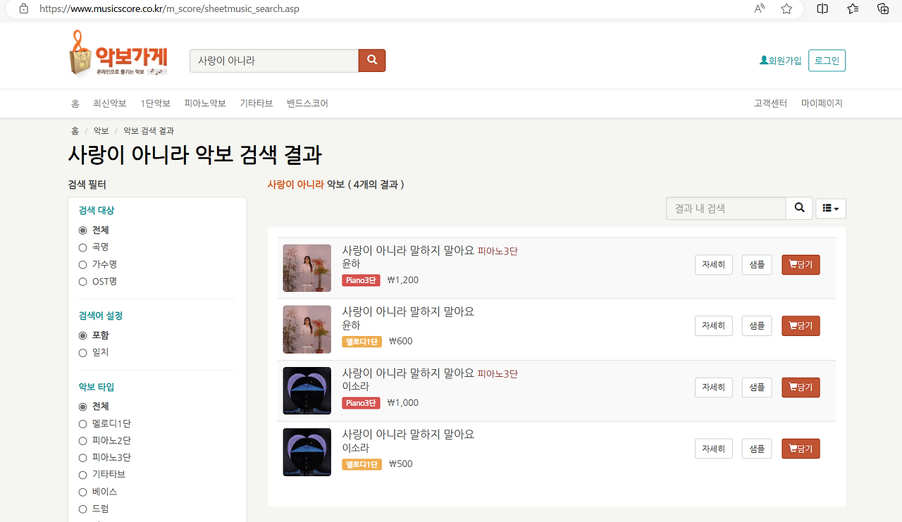 먼저 기타 코드를 표기한 악보가 필요하다. 대중가요 악보를 구매하여 프린터로 출력할 수 있는 인터넷 사이트가 있다. 근 일 년은 접속한 기억이 없다. 스마트폰의 메모장을 뒤져 아이디와 비밀번호를 찾아낸다. 다행히 인터넷 사이트도 아이디도 살아있다. 노래 제목을 입력하여 검색한다. 마침 여러 버전의 악보가 검색된다. 최신곡이냐, 주음계와 부음계가 모두 표기된 2, 3단 악보냐에 따라 가격이 다르다. 내가 찾는 노래는 비교적 옛 노래고 기타 코드만 필요한 1단 악보이므로 단돈 오백 원이다.