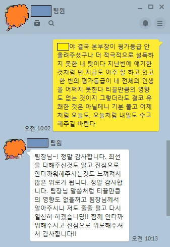 - 팀원] 팀장님! 정말 감사합니다. 최선을 다해주신 것도 알고 진심으로 안타까워해 주시는 것도 느껴져서 많은 위로가 됩니다. 정말 감사합니다. 팀장님 말씀처럼 티끌만큼의 영향도 없을 거고 팀장님께서 알아주시니 저도 훌훌 털고 다시 열심히 하겠습니다. 함께 안타까워해주시고 진심으로 위로해주셔서 감사합니다!