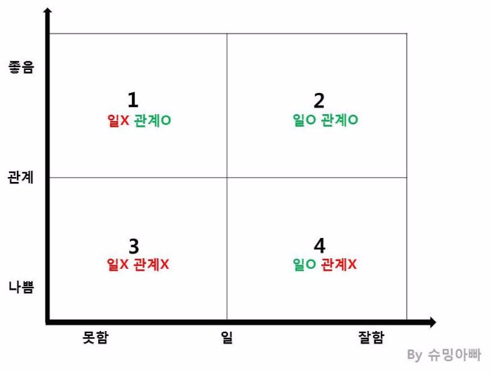 4가지 경우를 살펴보았다. 내가 3번의 경우에 있다고 실망할 필요는 없다. 2번 유형으로 가기 위해 노력하면 된다. 2번 유형이 되지 못해도 괜찮다. 현재 일이나 회사가 나와 맞지 않을 수도 있다. 좋아하고 잘할 수 있는 것을 찾아보자. 가끔 스스로에게 실망할 때 하는 생각이 있다.