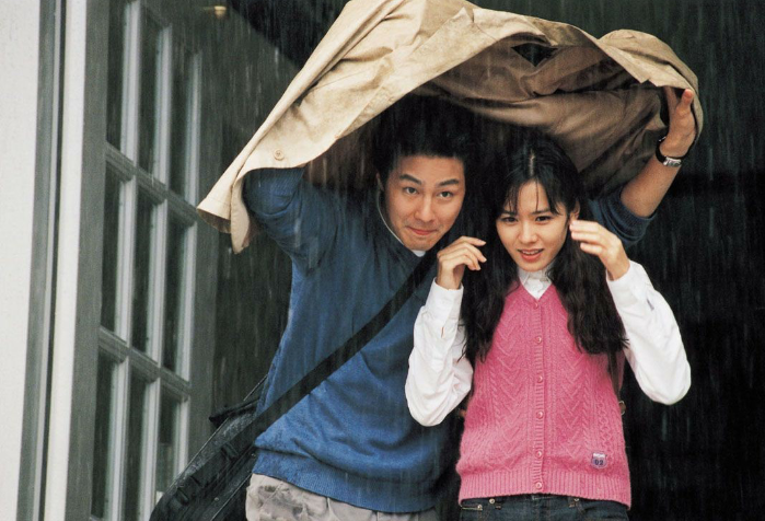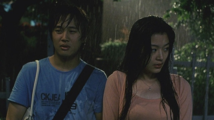 남녀가 함께 옷으로 머리를 가리며 빗속을 달려가는 장면..