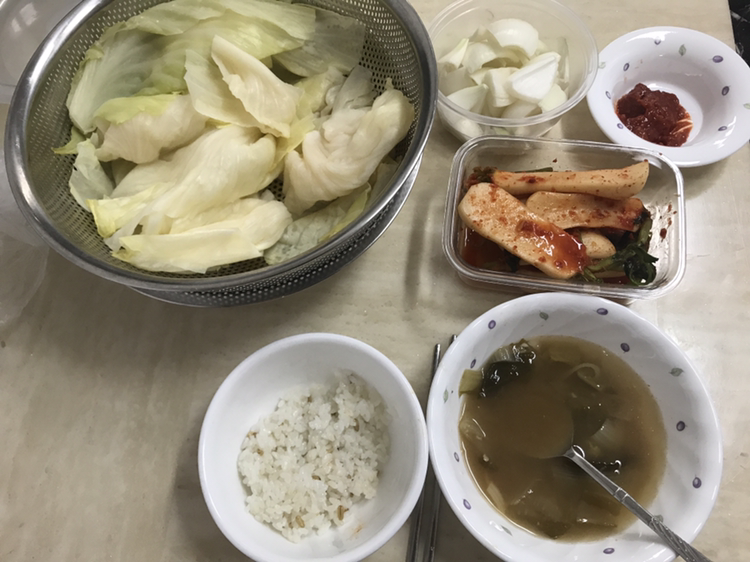 역시 2주 가까이 매끼 식사에 올랐다. 삶은 양배추에 밥을 싸서 먹었다. 맛이 그리 좋지는 않지만, 몸 생각해서 먹었다. '나는 건강해진다. 나는 화장실에 잘 간다' 스스로 다짐을 하며 먹었다. 소화가 잘되고 포만감이 느껴진다는 장점이 있다.