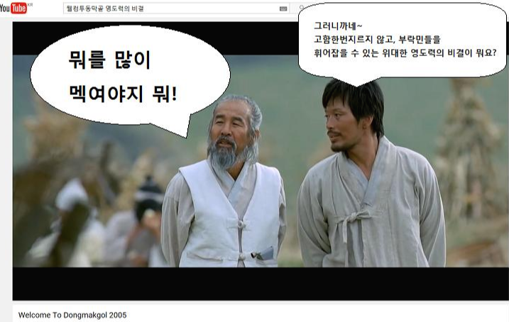 영화 '웰컴 투 동막골'에서 마을 사람들이 촌장의 말을 너무 잘 따르자 북한군 장교가 동막골 촌장에게 묻는다.