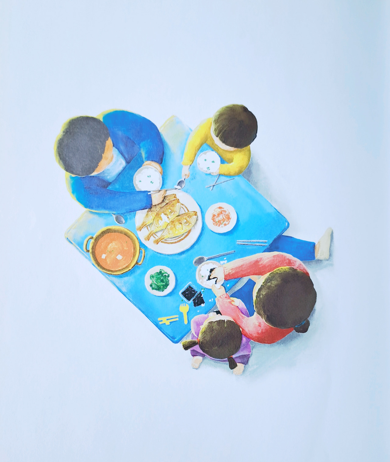 찌개와 김치와 나물과 김, 그리고 밥상 가운데 아빠가 일 끝내고 사 온 조기가 있다. 엄마는 밥에 김을 싸서 어린 딸을 먹이고, 아빠는 조기 살을 발라 아들의 숟가락에 얹어 준다. 타일 조각 같이 푸른 밥상을 둘러싼 네 식구의 모습이 그림책의 마지막 장면이다. 식구들이 둘러앉은 밥상. 그것이 타일을 붙이는 아빠의 목적이고 무게이자 절정이었다. 가장의 비애와 행복이 밥상에 같이 있다.