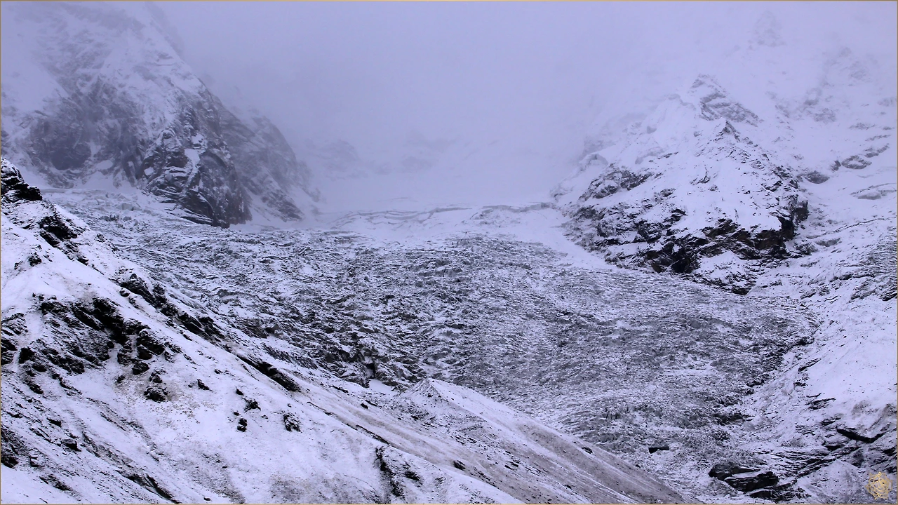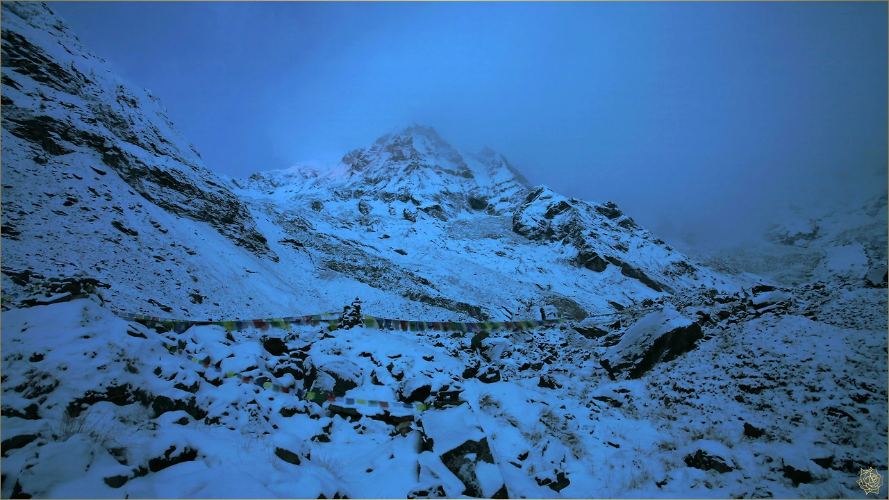 높고 깊은 곳에 위치한 안나푸르나 베이스캠프에 도달했지만, 날씨는 몹시 춥고 눈은 계속해 내립니다.