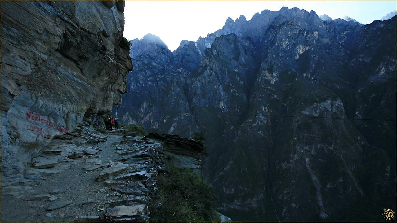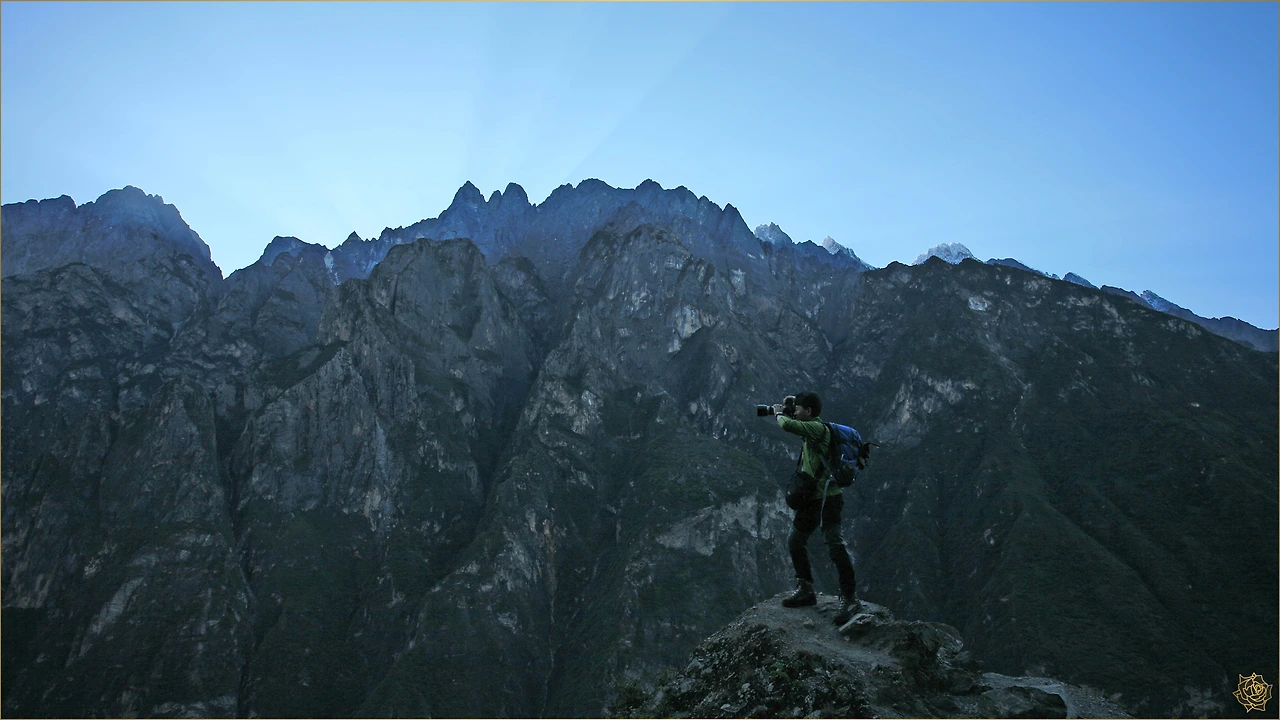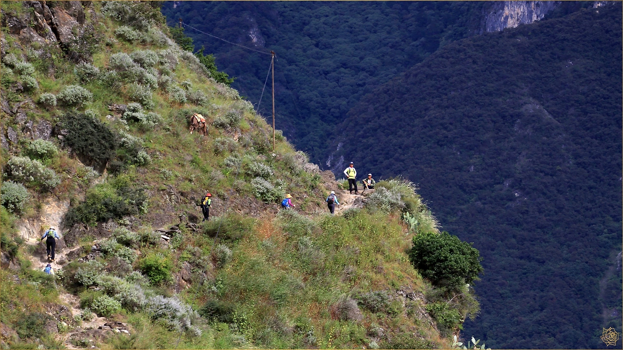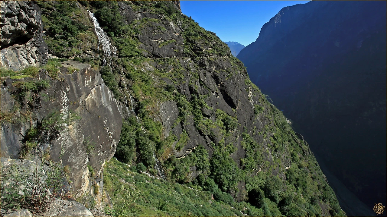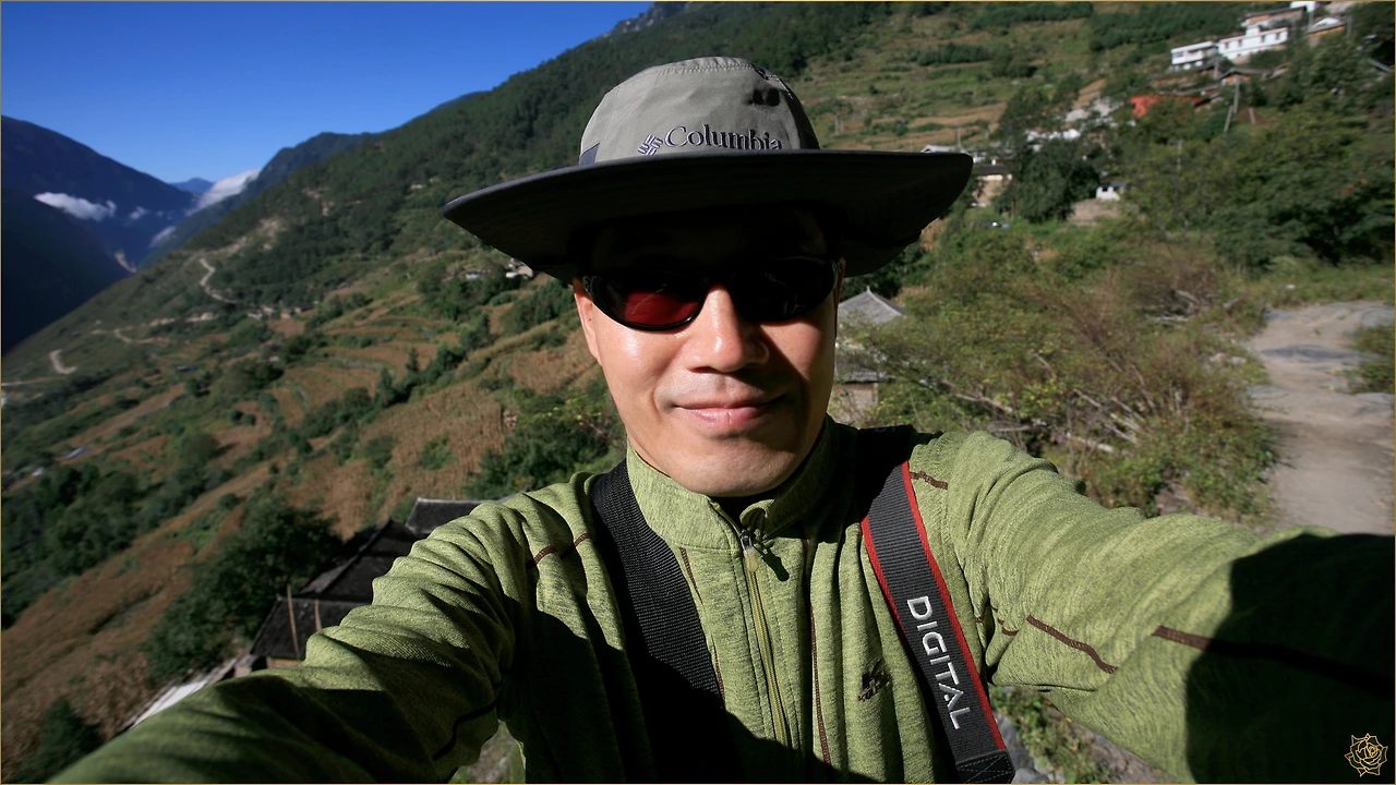 망원렌즈가 달린 카메라와 광각렌즈가 달린 카메라 두 대를 메고 내 나름의 아름다움을 담아 봅니다. 그냥 스쳐 지나갈 수 있는 옥룡설산의 구석구석을 망원렌즈로 당겨보고 직벽에 가까운 산을 보면서 거기에 메달려 있는 느낌을 받기도 합니다. 걸어가는 길에서 내려다 본 깊고도 깊은 호도협의 금사강을 바라보노라면 황토빛 급하게 흘러가는 물의 거센 힘에 자연에서 분출되는 강력한 힘을 느낍니다.
