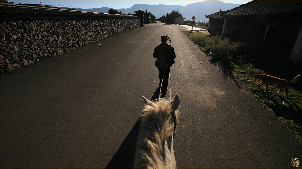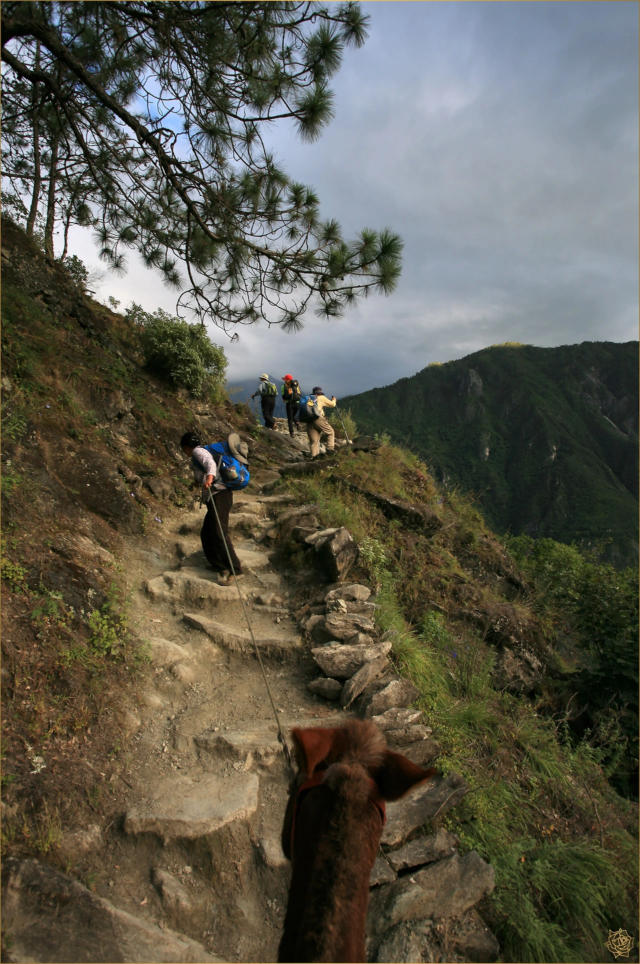 나는 일행들과 자꾸 멀어지기만 합니다. 짊어진 것들이 부담이었을까요? 사진 한 장 담고나니 십 미터는 족히 뒤처집니다. 사진을 담으며 산행을 하다보면 언제나 그렇습니다. 일출소우에서 출발 하면서부터 나시족 아주머니 한 분이 말을 끌고 제일 뒤에 처져있는 나만 뒤따라 옵니다. 딸랑 딸랑 워낭소리가 귀에 거슬립니다. 나는 산행을 하면서 조용한 것을 좋아하기 때문에 처음에는 경쾌하게 들렸다가 나중엔 반복되는 같은 소리에 시끄러운 잡음으로 들립니다. 말이 통하지 않으니, 손짓으로 먼저 가라고 하지만 웃으며 않가겠다 합니다. 그럼 뒤에 뚝 떨어져 오라고 손짓을 하니, 겨우 2~3m 뒤로 물러납니다.