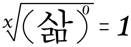 위 공식에서, '삶의 0승'은 '1'이며, 따라서 '루트 1의 x승근' 또한 '1'이고, 결국 위 공식의 '결과치는 1'입니다. 아무리 우리의 현실이 복잡하고, 비수학적이며, 비정형적非定型的인 것이 삶이라 해도, 수학적 의미를 부여 해보니, 결국 '그 결과는 단순한 1'이었습니다. 숫자 1이란 ‘자기자신’을 의미하며, 바로 삶의 본질인 ‘홀로 가는 길’이자, 하나의 ‘생명개체’를 의미하며, 바로 '위 공식의 결과'입니다. 그런 개체들이 모여사는 우리사회는 1+1+1+1+1…… 즉, 모임의 철칙과 혼란 속의 질서를 말합니다. 그 사회에서 함께 살지만, 결국 삶이란 홀로 가는 길입니다. 나라는 존재가 원점으로 회귀回歸할 때 , 이 사회구성원 모두가 나와 함께, 동시에, 피안彼岸의 세계로 갈 수 없는 것과 같은 이치理致입니다.
