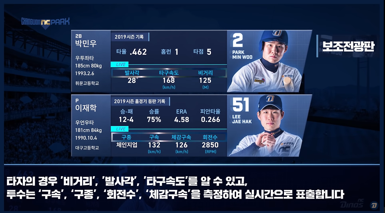 NC 다이노스는 게임 회사답게 대형 전광판을 구축하여 각종 트래킹 데이터를 실시간으로 표출한다. 타구의 발사각, 타구 속도, 비거리 등등 기존에 팬들이 보지 못했던 데이터를 현장에서 실시간으로 표출할 수 있게 되었다. 또한 관중들이 더 즐겁게 이벤트에 참여할 수 있도록 전광판에 증강현실(AR) 기술을 더했다.