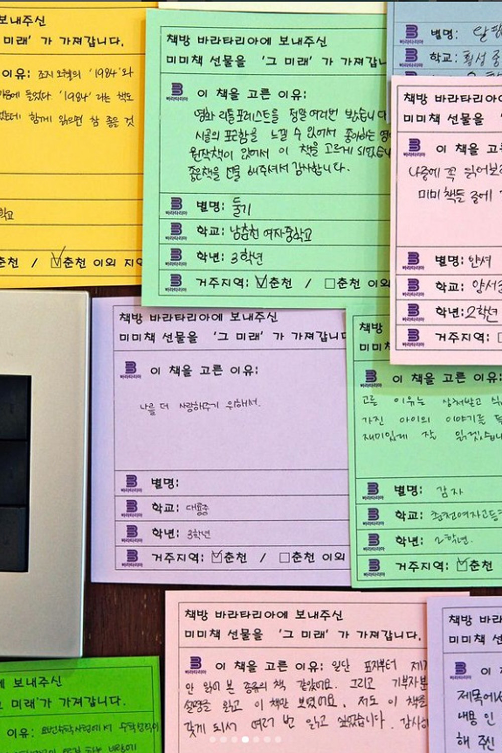 춘천 책방 바라타리아에 관심이 생긴 건 ‘미미책 선물’ 때문이었습니다. 풀어 쓰면 ‘미래로 보내는 미리 계산한 책’입니다. 책방을 방문한 어른들이 2층 서가에서 책을 골라, 미미책 서가에 짧은 메시지와 함께 비치합니다. 그럼 책방을 방문한 청소년(14~19세)들은 원하는 책을 무료로 가져가는 방식입니다. 맡겨 둔 커피, 카페 소스페소처럼 말이죠.