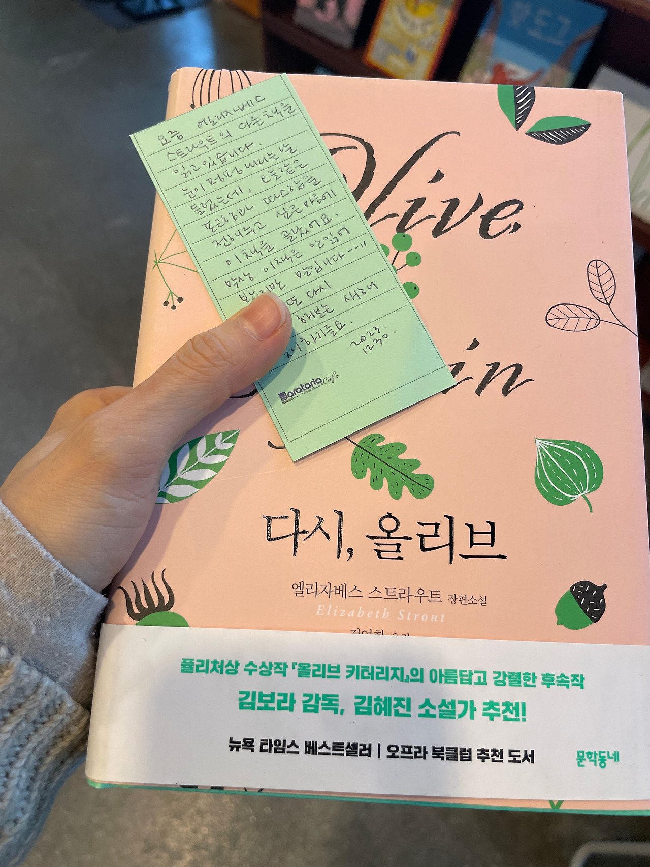 옆지기와 고민 끝에 고른 책은 ‘다시, 올리브’(엘리자베스 스트라우트/문학동네). 2008년 퓰리처상 수상작 '올리브 키터리지'의 후속작입니다. 이 책을 보게 될 내일의 그들에게 짧은 메모를 더합니다. 실은 우리 두 사람이 서로에게 해주고픈 말이기도 했습니다.