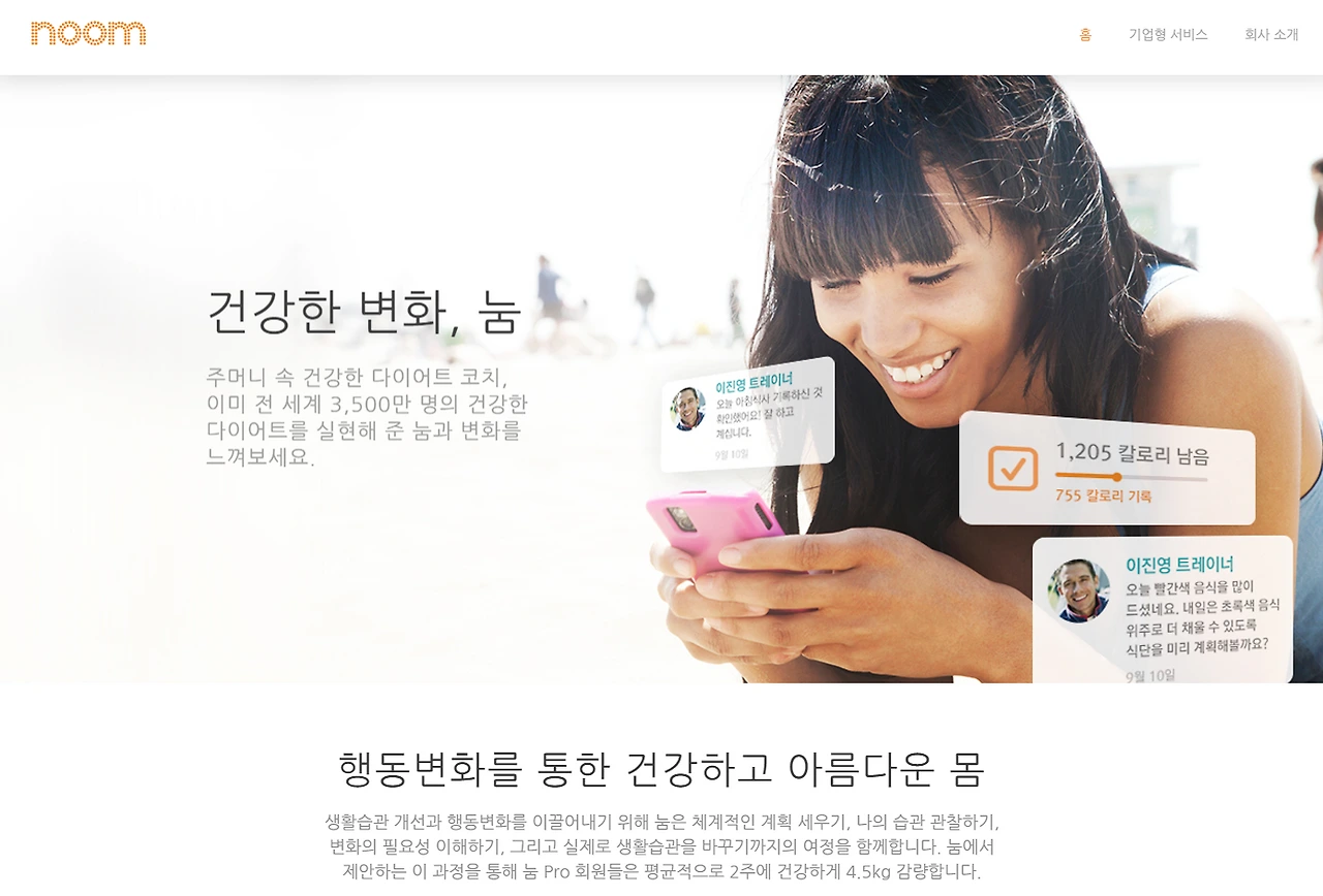 [Noom(눔)은 모바일 헬스케어 기술 회사로, 2006년 정세주 대표와 구글 수석 엔지니어 출신인 아텀 페타코브가 함께 설립하였다. 2009년과 2010년에 구글이 선정한 가장 혁신적인 개발사로 뽑혔으며, 2012년 12월에 한국어 버전을 출시하고, 2013년 5월에 '눔코리아(Noom Korea)'를 설립하였다. 건강한 생활을 더 많은 사람들이, 더 쉽게 실천할 수 있도록 돕는 것을 미션으로 하고 있다.]
