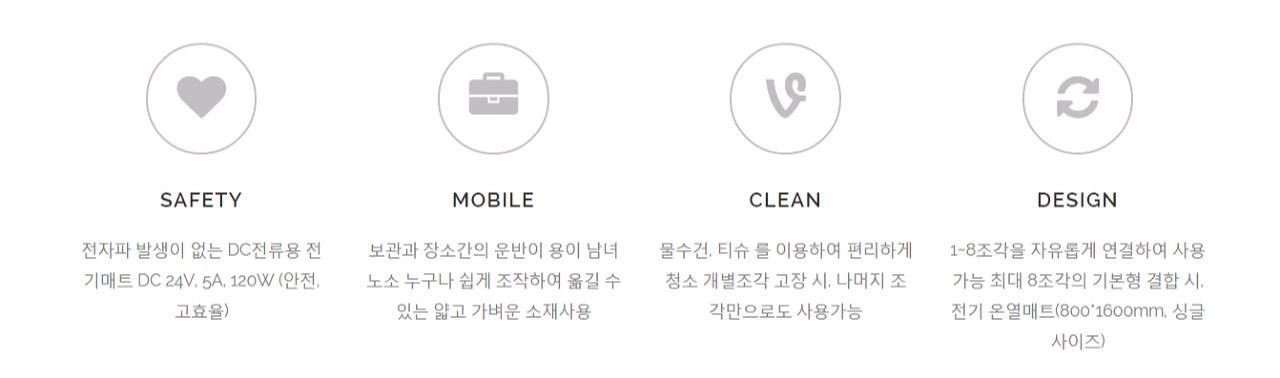 우선 ‘안전성’에 대해 부분이에요. 대부분 전기매트는 AC발열체(교류 전류)를 써요. 근데 저희는 DC발열체(직류 전류)를 쓰죠. 이 차이점이 뭐냐면요. AC발열체(교류 전류)는 추운 겨울날 열을 빠르게 오르게 하는 장점이 있지만, 전자파 발생이나 화재 위험과 같이 안전 사고를 일으키는 핵심 원인이 돼요. 반면에, DC발열체(직류 전류)는가열되는 시간은 다소 더딜 수 있지만, 전자파 발생이 없고, 더불어 고효율로 전기세 부담도 덜 수 있어요.