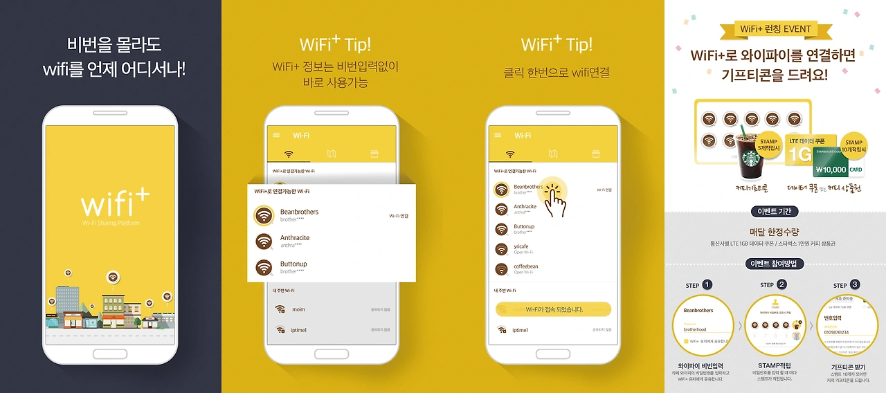 와이파이를 편리하게 사용할 수 있는 애플리케이션이에요. 카페에 왔는데 비밀번호가 걸려있을 때, 와이파이플러스 앱을 키고 해당 와이파이를 선택하면 비밀번호를 입력하지 않아도 연결이 돼요. 단, 최초 공유자가 비밀번호를 입력해줬을 때 가능해요. 누군가 비밀번호를 입력해주면 다른 사람들은 와이파이플러스앱을 키면 바로 쓸 수 있어요. 최초 공유자에겐 따로 혜택을 주고 있어요.