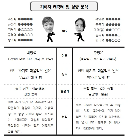 앞서 말했듯이, 우리는 다양한 이유로 많이 다퉜다. 그중에서도 정말 ‘대차게’ 싸워 하마터면 프로젝트 자체를 중단할 수도 있을 뻔했던 몇 가지 에피소드를 소개하고자 한다. 그전에, 이번 프로젝트를 진행한 우리 두 기획자는 도대체 어떤 사람인지 한 번 살펴보자.