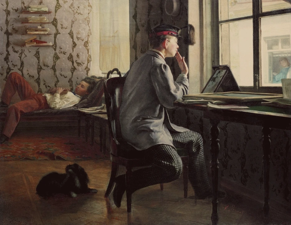 그림 속 벽지, 바닥, 창틀, 기타 소품에서 표현된 오래된질감 또한 부드러운 빛을 만나 디테일이 더욱 잘 표현되었다. 벽지의 보라색, 자고 있는 친구의 바지와 카펫의 붉은색, 창 너머 여인의 푸른색의 색 배분도 흥미롭다. 채도와 명도가 높지 않고 적절하게 보색의 배분을 잘 활용했다. 다만 창 너머에 여인을 그려 넣은 건 세련되지 못한 느낌이 있다. 여인의 시선이 책을 보고 있으면 어땠을까 하는 생각을 해 본다. 레핀의 의도가 있었겠지만.