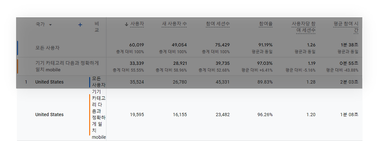 기본적으로 보고서 데이터는 모든 정보를 포괄해서 제공합니다. 좀 더 세부적으로 고객 행동을 분석할 때 세그먼트를 활용하는데요. 위 이미지는 미국 고객 중에서 모바일로 유입한 고객을 세그먼트했습니다.