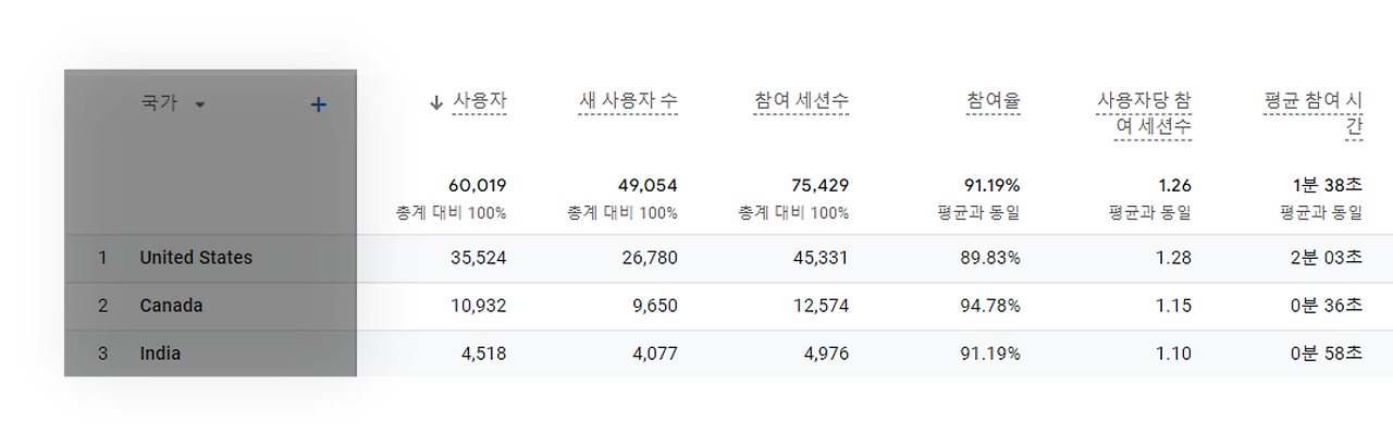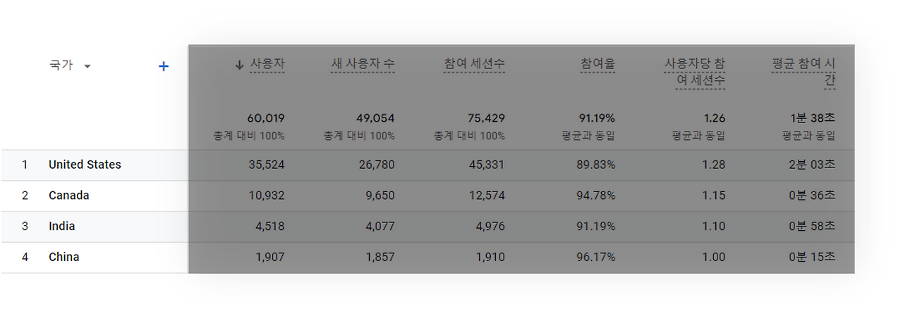설정한 사용자, 새 사용자 수, 참여율 등의 측정항목 별 값을 보여줍니다.