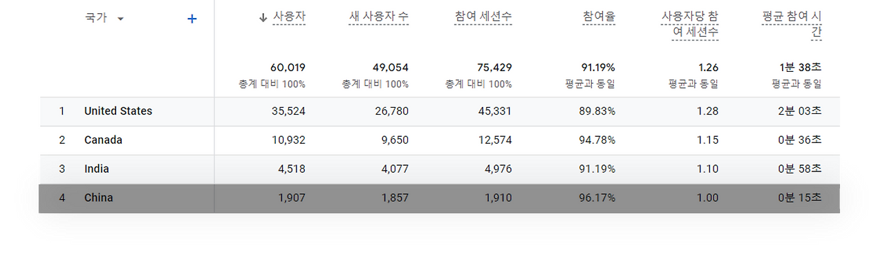 '국가' 측정기준 설정 시 United States, Canada, India, China 등의 나라 리스트가 쭉 열거됩니다.