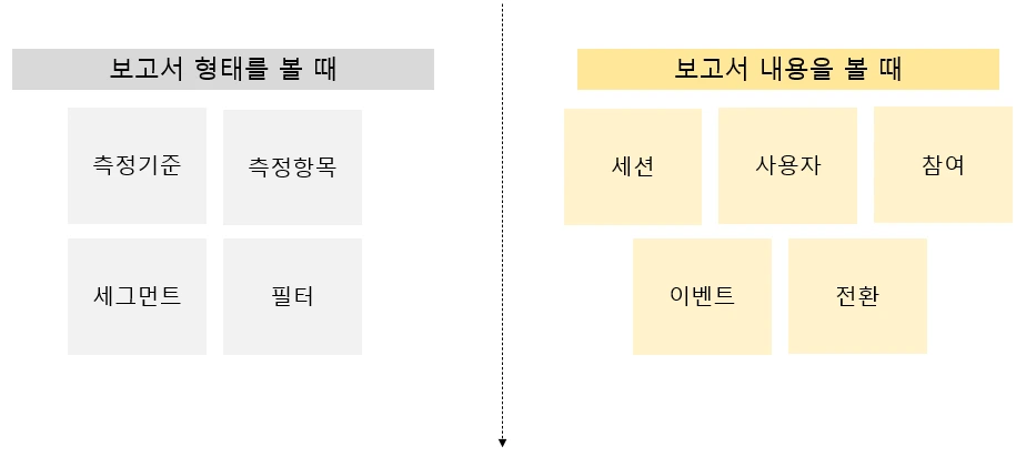 GA4 보고서에 필요한 용어는 크게 2가지로 나뉩니다.