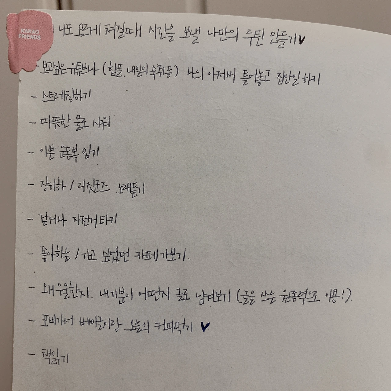 너무나 명확한 조언에 나에게 가장 필요하다고 느낀 건 나 혼자 있는 시간. 정말 중요하고 재미있는 약속을 잡는 것처럼 1순위로 두고 시간을 빼기로 했다. 나와의 약속을 잡는다고 생각하고, 다른 약속들은 어떻게든 미루고 취소하더라도 나 혼자만의 시간을 최대한 확보하기로 했다.