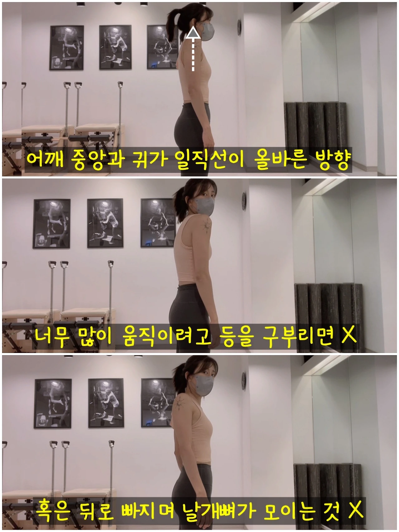 어깨가 자꾸 으쓱하는지 확인하며 거울을 보고 하거나, 처음에는 팔 한쪽씩 연습해보고 하셔도 좋습니다!