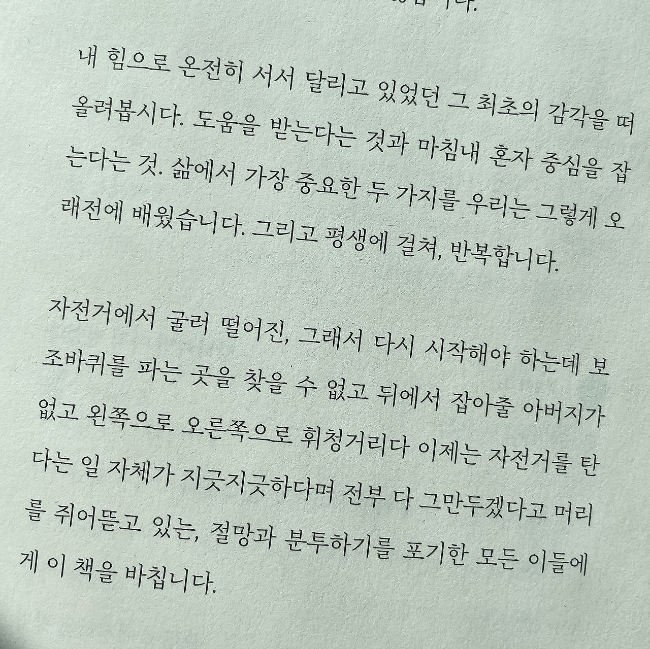 한참 전에, 그것도 아마 사전 예약 구매로 산 책인데 지금에서 읽는 이유는 이제야 읽고 싶다는 생각이 들어서다. 이 책을 샀을 때는 그렇게 죽을 듯이 우울하지는 않았지만 살고 싶어지는 것 역시 싫었다. 뭔가를 좋아하면 항상 힘들어지니까. 삶도 사랑하고 싶지 않았다. 그렇게 살고 싶어 하기 싫었다. 당장 죽을 건 아니었지만 그렇다고 죽어도 별 상관없는 딱 그 정도가 편했다. 어떤 것에도 미련 가지지 않고 둥둥 떠있는 어느 애매한 지점에서 매일매일 할 일을 그저 충실히 해내면서 지내고 싶었다. 무슨 대단한 희망을 꿈꾸지도, 행복을 바라지도 않으면서.