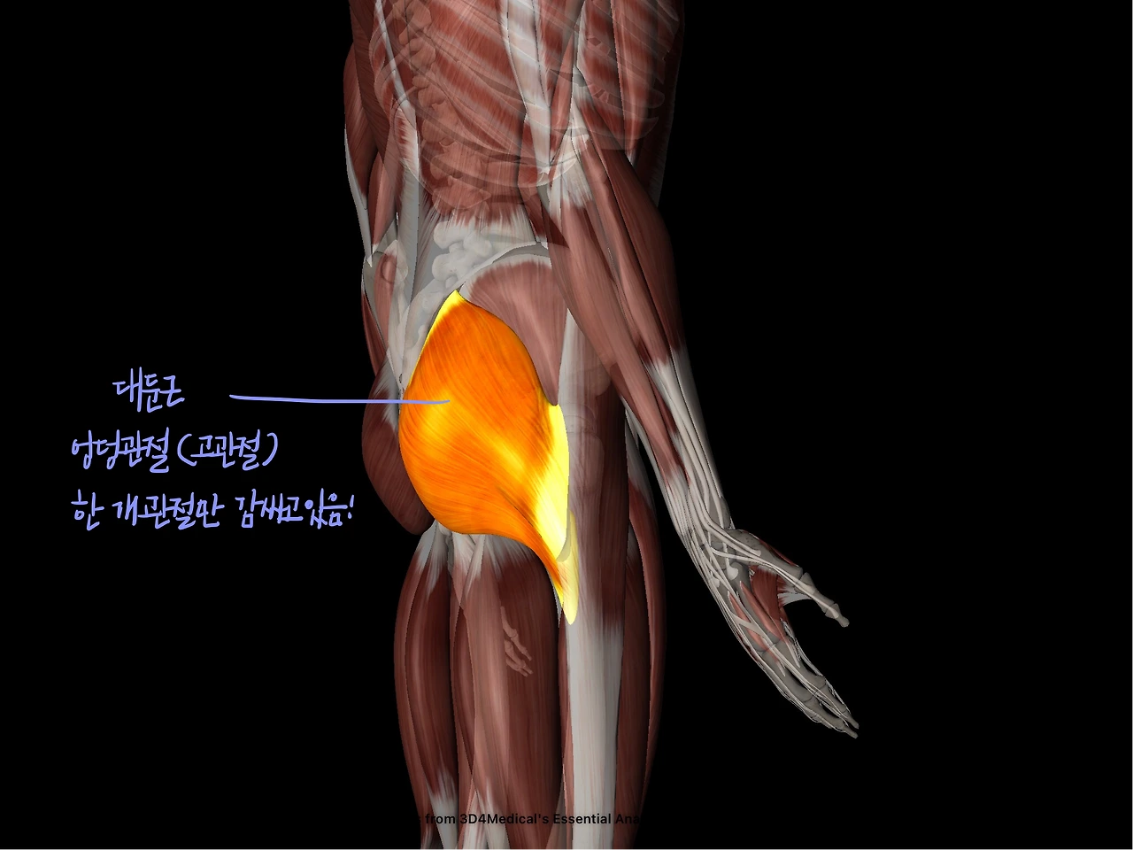 겉에 있는 큰 근육들은 보통 한 개의 관절이 아닌, 여러 관절을 지나가는 경우가 많습니다. 투조인트 머슬이라고 하죠. 대표적으로는 햄스트링이 있는데요 엉덩 관절과 무릎 관절, 두 개의 관절을 지나면서 몸통의 바깥쪽에 가까운 아주 크고 힘이 센 근육입니다. 이와 비교해서 원조인트 머슬, 즉 한 개의 관절만 감싸고 있는 엉덩이 근육들, 둔근과 중둔근들을 같이 살펴보죠.