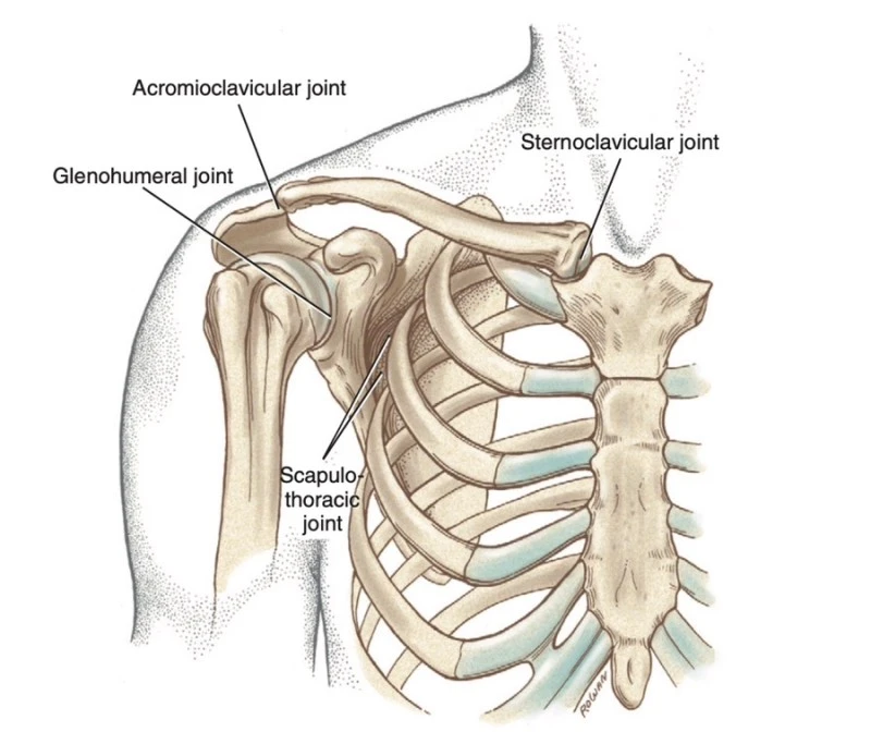 어깨 관절은 복합 관절로 다양한 관절들의 적절한 협응이 고르게 잘 일어나야 건강하게 움직일 수 있습니다. 기본적으로 '관절'이라 함은 뼈와 뼈가 만나는 지점입니다. 어깨 관절은 4개의 관절로 나눠볼 수 있는데요. 복장뼈-쇄골/날개뼈 앞쪽 돌기-쇄골/날개뼈의 오목 관절-윗팔뼈/날개뼈-갈비뼈의 뒷면, 이렇게 네 개의 복합 관절로 이루어져 있습니다.