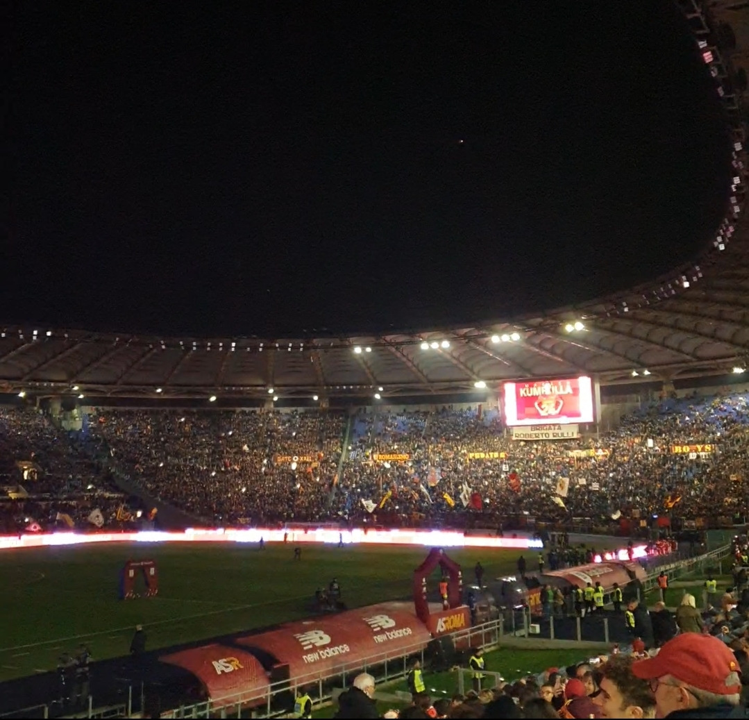 또다른 특징은 바로 노래 “Roma, Roma, Roma“입니다. 이 노래를 떼창하는 모습은 모든 이탈리아 프로축구리그 세리에 A 경기들 중에서도 가장 아이코닉한 순간들 중 하나로 꼽힙니다. 경기 시작 킥오프 직전에 불리는 이 노래는 로마 출신의 가수이자 작곡가인 Antonello Venditti가 만들어 1983년에 처음으로 불렀던 곡입니다. 이는 로마에 대한 헌정곡으로 “로마가 언제나 내 마음에 남아 있을 것.”이라는 의미의 가사를 담고 있는 감성적인 발라드입니다. 팀에 대한 애정과 충성심을 드러내는 가사로, 팬들에 의해 불리게 되었습니다. 이 노래를 부를 떄 AS로마의 팬들은 팀의 스카프나 깃발을 흔들며 부르는데 그 모습과 상기되어 있는 선수들의 표정을 교차하며 바라보니, 이 노래 하나로 팬들과 선수단이 하나가 되고 있다는 느낌을 받아 전율이 돋는 순간이었습니다. 또, 팬들을 존중하는 의미로 경기의 주심은 경기 준비가 완료되었음에도 노래가 끝날 때까지 기다렸다가 노래가 끝나는 그 순간 경기 시작 휘슬을 붑니다.