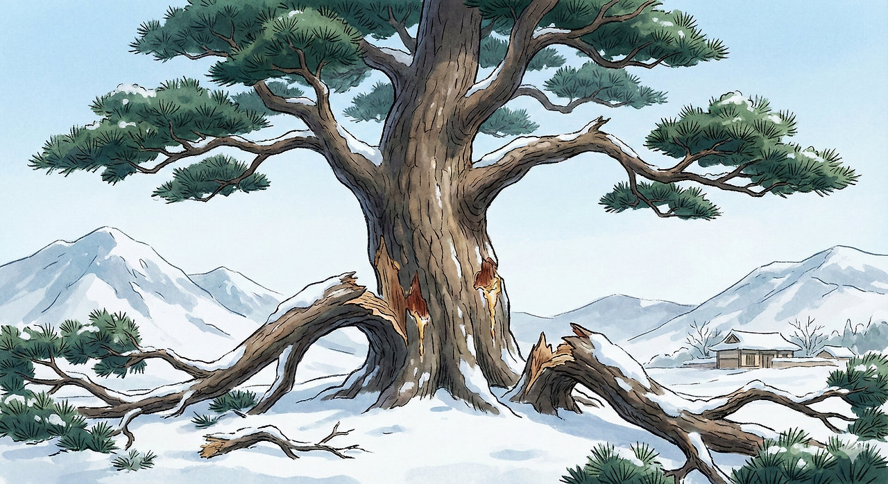 잣나무의 부러진 가지는 상처와 실패의 상징이라 보기 어렵다. 혹독한 겨울을 건넌 통행세이자, 생존해 낸 존재의 훈장에 가깝다. 사라진 가지로 풍성함은 사라졌으나 빈 곳을 채운 겸허함이 돋보인다. 화려함이 사라졌을지언정 존재의 본질이 단단하고 순순하게 남은 모양새다.