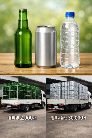 그러니까 같은 트럭에 유리병 대신 캔을 싣는다면, 무려 30,000개를 더 실을 수 있는 셈이에요.
