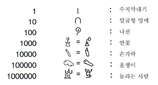 예를 들어 고대 이집트에는 10만을 나타내는 자릿수의 기호는 올챙이 모양이었는데, 당시 이집트의 나일(Nile) 강에 올챙이가 너무 많았기 때문이라고 합니다. 또한 사람이 놀라 팔을 들고 있는 모양의 기호도 있었는데 이 것이 100만을 나타내는 기호이자 당시 가장 큰 수였어요. 그래서 다른 말로는 많다는 의미로도 사용했다고 하죠.