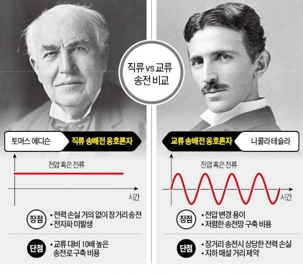 전류는 전압이 높은 곳에서 낮은 곳으로 흐르는데, 직류는 이 흐름이 항상 일정하기 때문에 전압을 변경하는 것이 매우 어렵습니다. 물을 거꾸로 퍼올리는 것과 같죠. 그래서 직류 전기는 고전압 전기 직송에 적합하지 않아요. 하지만 대부분의 전자 제품과 배터리에서는 안정적인 직류를 활용합니다. 건전지의 +, - 극을 반대로 끼우면 왜 작동하지 않는지 이해되시나요?
