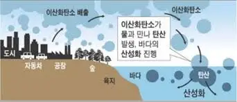 바닷물의 수소 이온 농도가 증가하는 현상을 말합니다. 대기 중의 온실가스인 이산화탄소(CO2) 양이 많아지면 바다가 흡수하는 이산화탄소 양 또한 증가하게 됩니다. 연구 결과에 따르면 해양은 연간 CO2 배출량의 약 23%를 흡수하여, 기후변화의 영향을 완화시키는 데 기여한다고 해요. 하지만 바다가 흡수된 이산화탄소는 물(H2O)과 만나면 탄산이 발생하게 되고, 해양이 점점 산성화가 되는데 이로 인해 해양의 화학적 특성도 바뀌게 되어 해양생물이 살아가는데 문제가 됩니다.