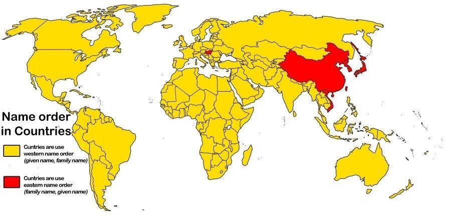 심지어 대부분의 서양 국가들이 이름 + 성을 쓰는 것과 달리 우리나라는 성 + 이름 순으로 사용합니다. 나보다는 내가 속한 그룹(가문)을 먼저 드러내는 것이 예의라고 생각하는 것이겠지요. 사실 성 + 이름 순으로 쓰는 국가는 매우 적어요. 극동의 한/중/일 세 나라와 베트남, 캄보디아, 헝가리(?) 정도예요. 이름을 먼저 나타내느냐, 성을 먼저 나타내느냐도 민족의 성향을 알 수 있는 대목이지요.