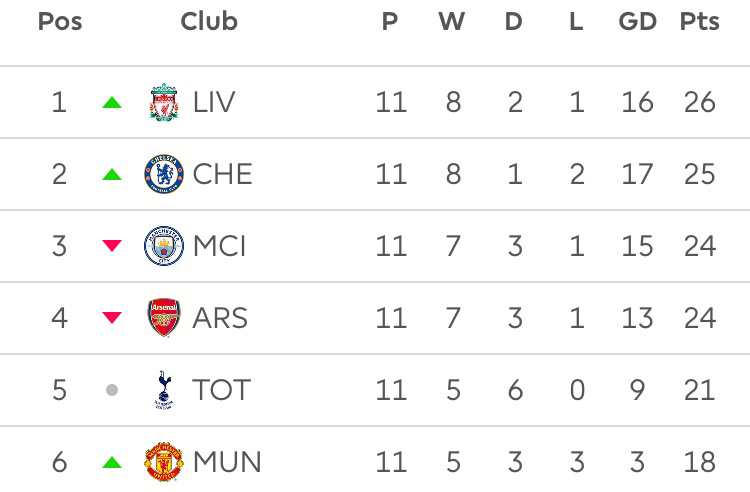 리버풀이 11경기 중 단 1경기 밖에 패배하지 않으며 승점 26점으로 리그 단독 선두에 올라있으며 그 뒤를 이어 첼시가 맨체스터 시티와 아스날 보다 승점 1점을 더 획득하며 2위 자리에 위치하고 있다.