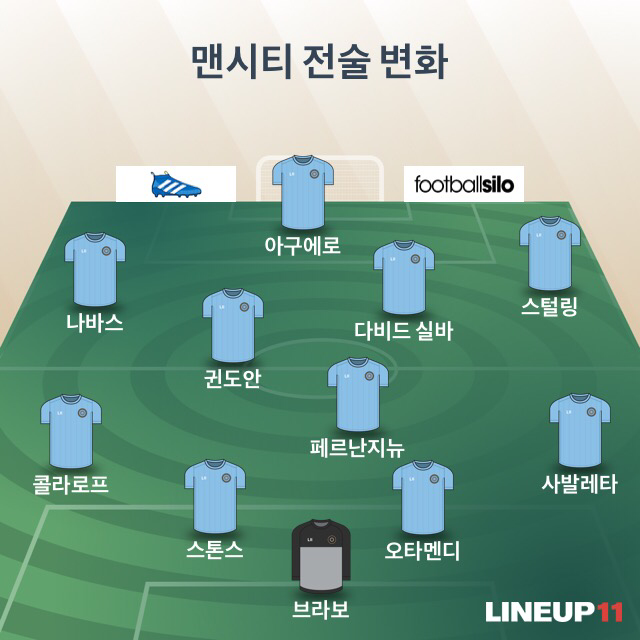 과르디올라는 분위기 반전을 위해 전반 내내 별 다른 활약이 없었던 측면 미드필더들의 위치를 서로 바꾸며 후반전을 시작했다 . 후반 52분에는 페르난지뉴와 귄도안을 교체하는 빠른 변화를 가져갔지만 효과는 크지 않았다 . 토트넘 선수들은 지치지 않았고 계속해서 압박의 강도를 낮추지 않았다 .