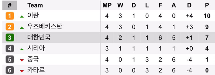 대한민국은 오늘의 패배로 인해 A조 3위로 떨어지며 월드컵 진출을 진지하게 걱정해야 하는 처지가 되어버렸다 . 아시아 최강 , 아시아의 호랑이라는 타이틀과는 어울리지 않는 초라한 모습이다 . 오늘 경기력만 본다면 과연 지금도 대한민국을 아시아의 호랑이라고 말할 수 있을까 하는 의문이 든다 .