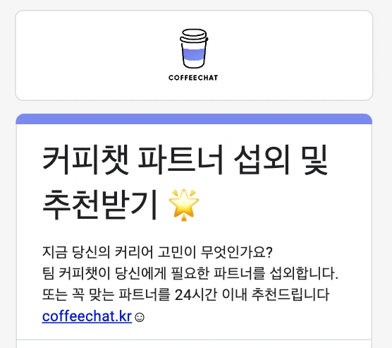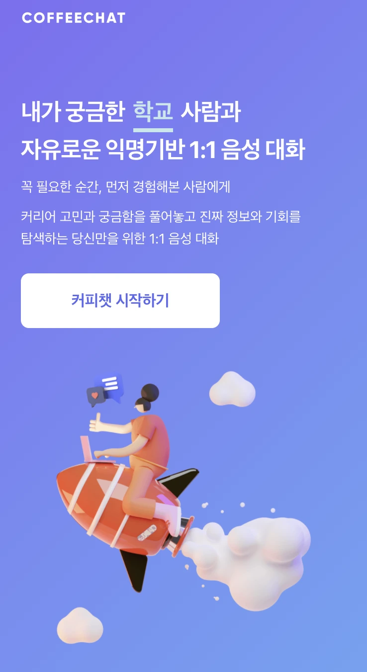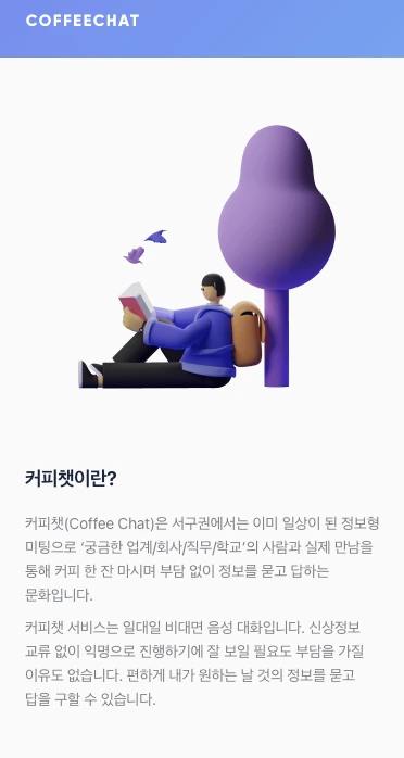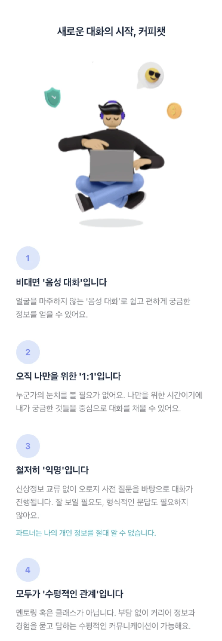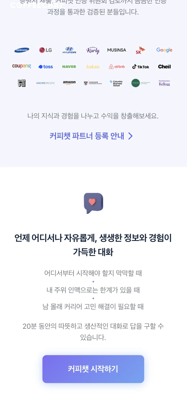 이 CTA 버튼은 커피챗 홈화면으로 랜딩된다. 이 랜딩 페이지를 보고 있는 사람이 '커피챗을 처음 접하는 사람'이라고 가정하면 홈화면으로 랜딩시키는 것은 좋은 접근이라고 생각한다.