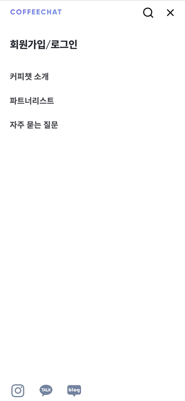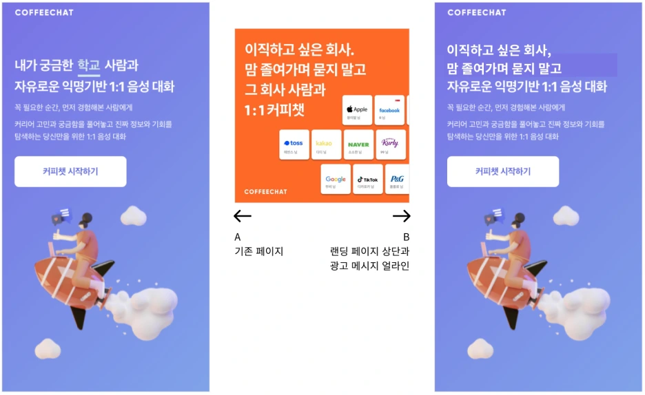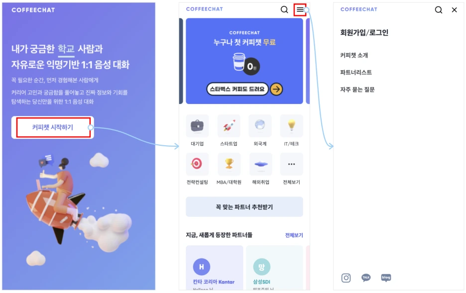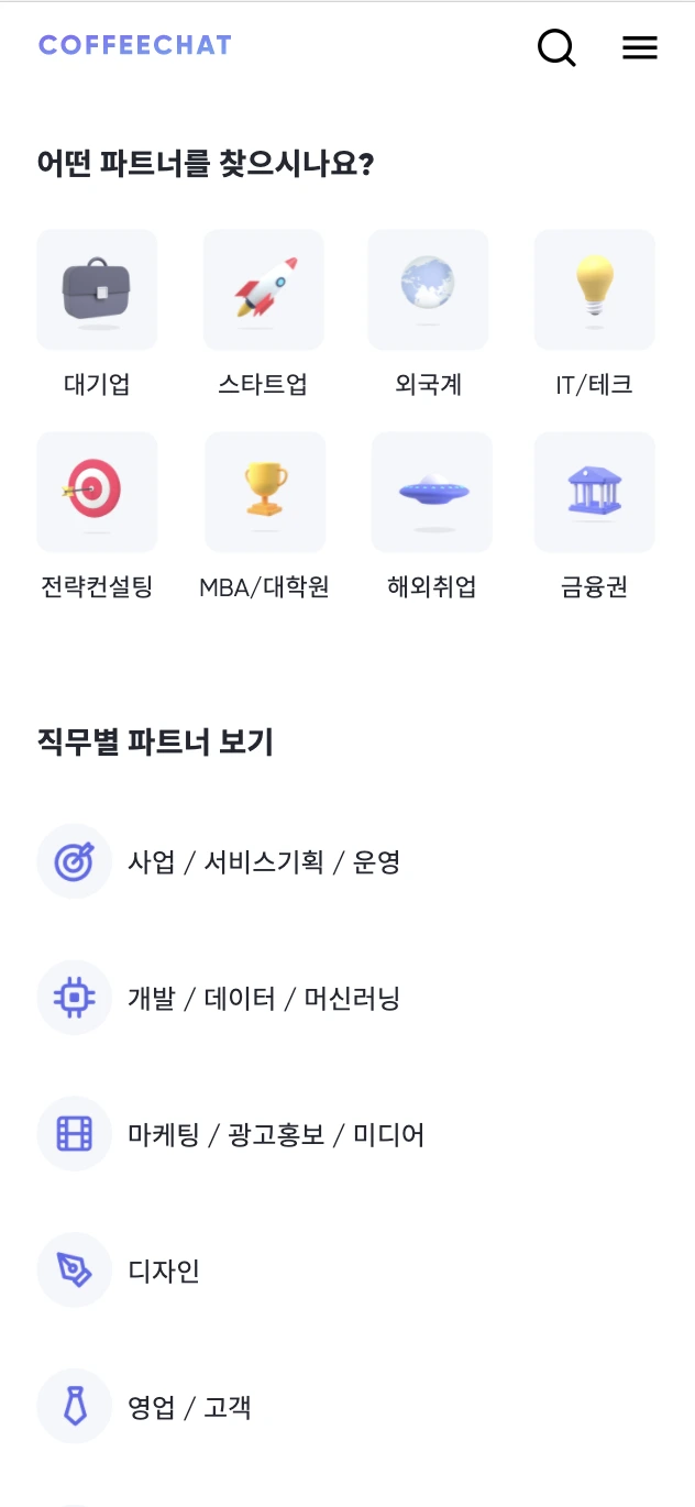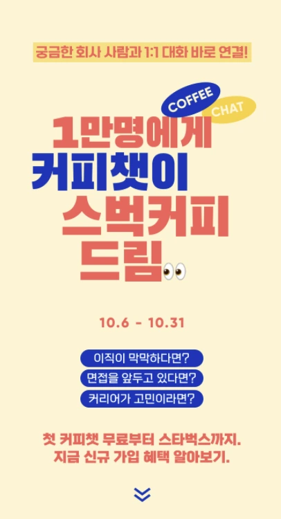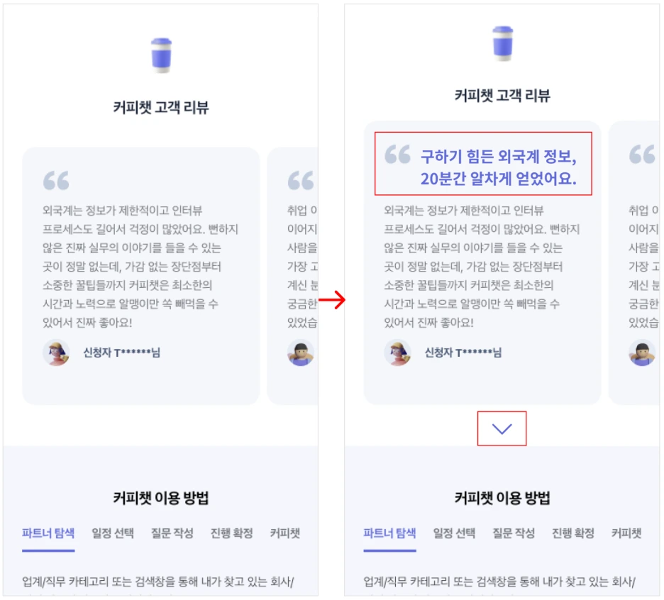 이 CTA 버튼은 커피챗 홈화면으로 랜딩된다. 이 랜딩 페이지를 보고 있는 사람이 '커피챗을 처음 접하는 사람'이라고 가정하면 홈화면으로 랜딩시키는 것은 좋은 접근이라고 생각한다.