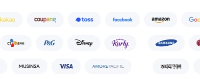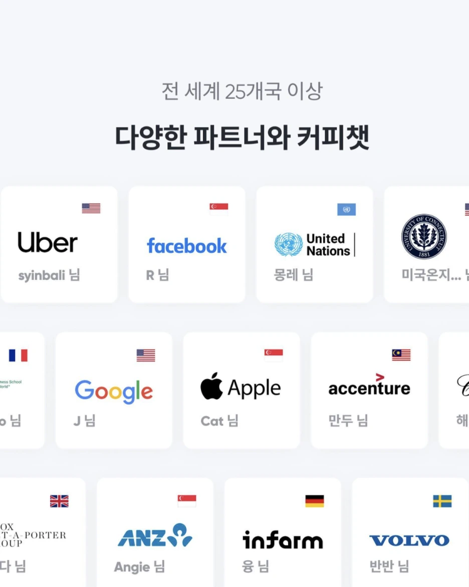 이 부분의 이미지 사용은 목적을 잘 모르겠다. 보기에 예쁘고 깔끔한 느낌이 서비스의 완성도를 높이고 있는 것 같기는 하나, 해당 스텝에서 설명하고 있는 커피챗 문화와 어울리는 이미지가 나오거나, 파트너 재직 기업 로고 GIF로(아래 이미지) 사용자들의 흥미를 끌어보는 것은 어땠을까?