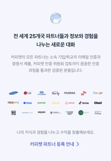 파트너 등록률을 높이기 위해 파트너 입장의 커피챗 후기 카드 몇 개 노출시켜도 좋을 것 같다! 플러스 효과로 파트너의 후기가 사용자의 서비스 신뢰도에 좋은 영향을 줄 거 같다.