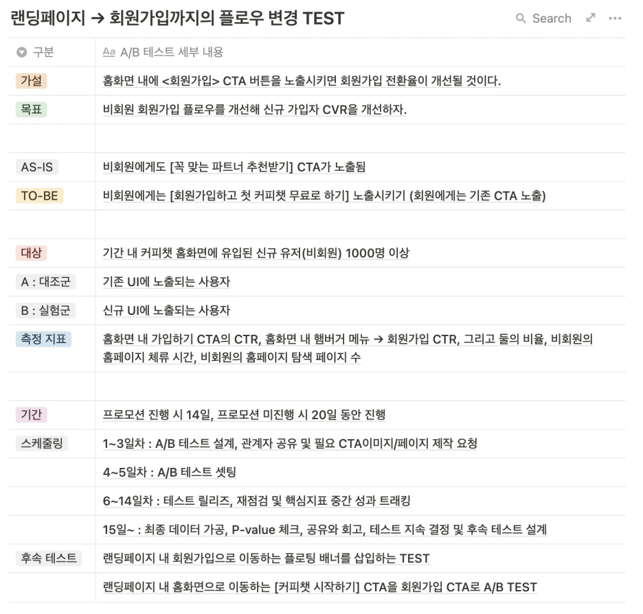 그래서 세운 가설! 비회원이 회원가입으로 가는 단계를 줄이기 위해, 홈화면에서 [가입하고 첫 커피챗 무료로 하기]가 노출된다면 회원가입 CVR이 개선될 수 있을 것 같다.