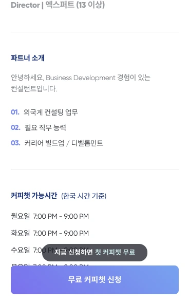 흥미로웠던 점. 여기서 최초로 가격, 게다가 어느 정도는 숨겨진 느낌(눌러야 열리는)으로 가격이 등장한다. 정말 뇌피셜이지만, 커피챗의 '첫 사용 경험' 이후 두 번째 구매로 가는 간격이 짧거나, 전환율이 높았던 것 아닐까? 가입만 하면 첫 사용은 무료에, 그리고 첫 사용자에게는 CTA도 '무료 커피챗 신청'으로 뜬다. 첫 사용자 입장에서는 가격정보에 신경 쓸 겨를 없이 첫 커피챗이 매칭 된다.
