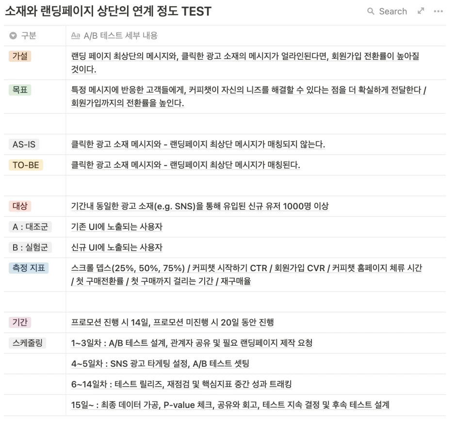 이 가설 설정은 개인적인 경험에 바탕한 것인데, 이전에 커머스 브랜드의 랜딩페이지와 소재 메시지의 얼라인 정도에 따른 CVR 비교 테스트를 진행해본 적이 있다. 랜딩페이지 상단 문구와 관련있는 소재 A와, 상단 문구와 조금 다른 소구 메시지를 담은 B의 CVR 비교했을 때, A의 전환율이 더 높았다. 물론 이 결과가 모든 테스트에 적용되는 것은 아니겠지만 어느 정도는 논리적인 결과라 생각되어서 이번 과제에서도 해당 내용으로 AB테스트를 계획해 보겠다.